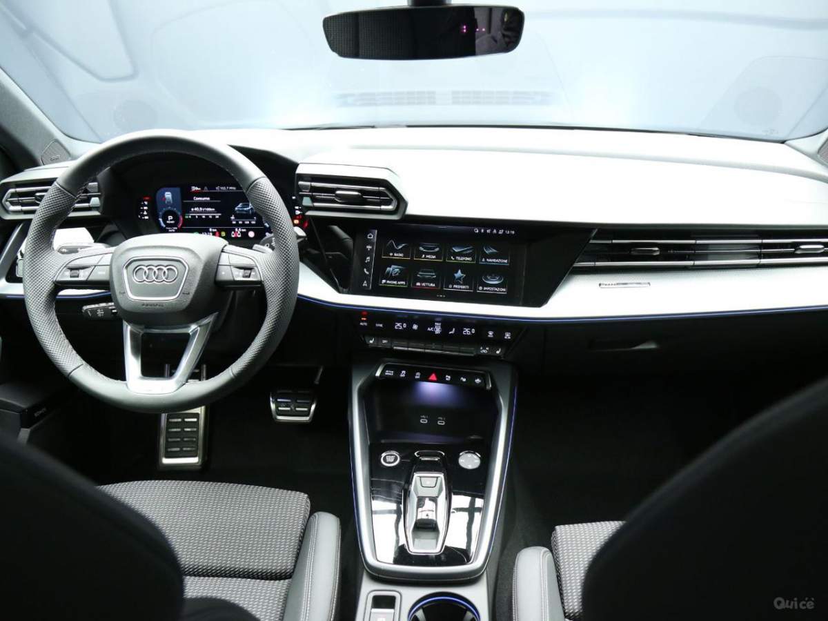 Di Serie: - 1G8 Kit riparazione pneumatici - 1XX Volante multifunzionale sportivo in pelle con Tiptronic - 3L3 Sedili anteriori regolabili manualmente - 3NZ Schienale del sedile posteriore ribaltabile - 4G3 Assistente agli ostacoli con assistente alla svolta (turn assist) - 6E3 Appoggiabraccia centrale anteriore - 6I6 Lane departure warning con emergency assist - 6Y2 Impianto di regolazione della velocità incluso limitatore della velocità - 7B9 Porte USB tipo C posteriori - 8N6 Sensore pioggia/luci - I8Y MMI Radio Plus - KA2 Telecamera per retromarcia posteriore - PYC Pacchetto Climatizzazione plus: 4A3 Sedili anteriori riscaldabili, KH5 Climatizzatore automatico a tre zone - PYY Pacchetto Comfort Plus: 4L6 Specchietto retrovisivo interno schermabile automaticamente, senza cornice, 6XI Specchietti retrovisivi esterni regolabili, riscaldabili, ripiegabili elettricamente e con antiabbagliamento, 7P1 Supporto lombare a 4 vie per i sedili anteriori, a reg. elettrica in senso orizzontale e verticale - QR9 Sistema di riconoscimento della segnaletica basato su telecamera - QV3 Ricezione Radio digitale (DAB).