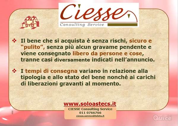 Incarico di consulenza gratuito fino alla partecipazione. - Possibilità di mutuo dal 70% al 100% del valore di aggiudicazione, a seconda delle caratteristiche del cliente e dell'immobile. Consulente in sede. - Tel. 011-0766766 - cell.327.3556295 - Sig. Bruno - solo orari ufficio. Serve recapito telefonico per essere contattati. --- annuncio pubblicato con GESTIONALEIMMOBILIARE.it