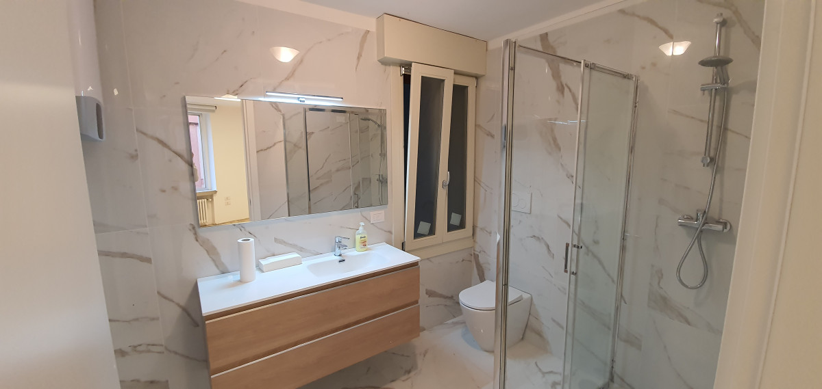 Appena rinnovato, cucina completa nuova, bagno completamente nuovo,impianto elettrico a norma, pavimento nuovo, impianto di aria condizionata nuovo, radiatori nuovi, tende elettriche e binari per tende già installati. Cucina composta da piano cottura elettrico/gas, forno, lavastoviglie, frigo e congelatore, microonde tutto nuovo.